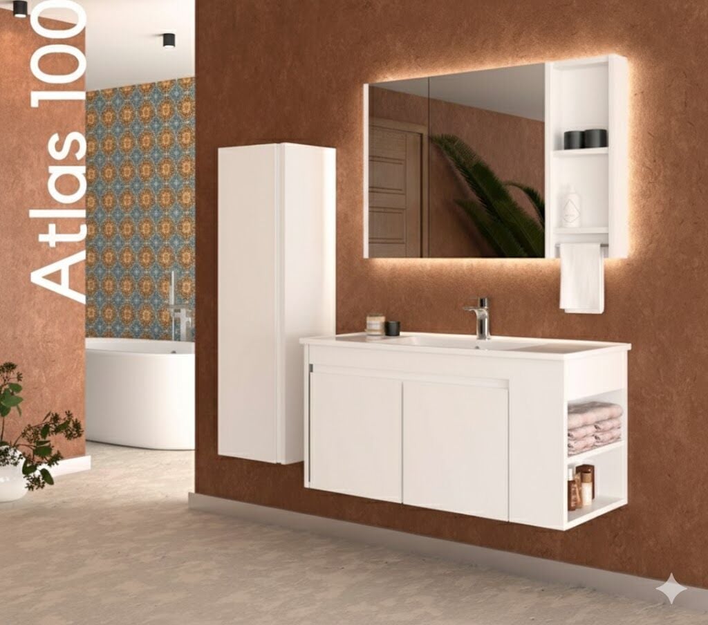 Atlas 100 cm Lavabolu Banyo Dolabı, güçlü duruşu ve geniş ölçüsüyle büyük banyolar için estetik ve fonksiyonel bir çözümdür.