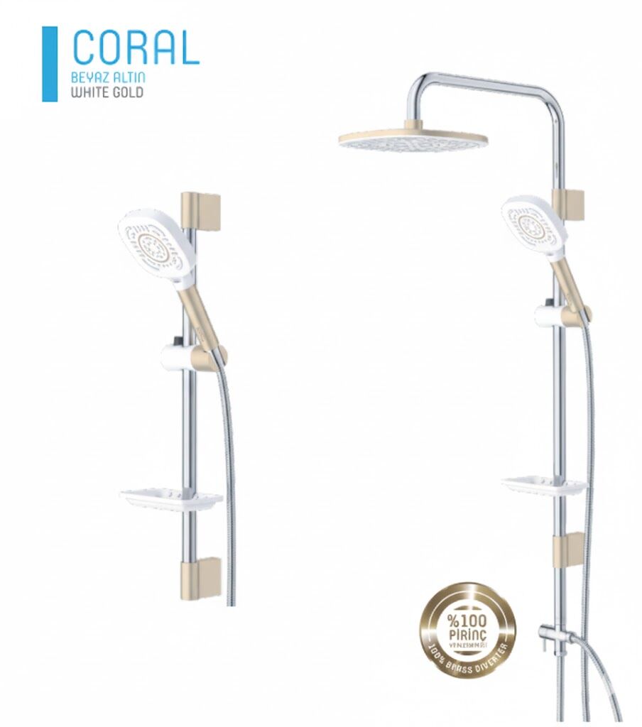Beyaz Altın Tepe Duş Sistemi, zarif beyaz gövdesi ve altın detaylarıyla banyolara şıklık ve lüks bir görünüm kazandırır. Modern ve klasik dekorasyonlarla uyum sağlayan tasarımı, estetikle fonksiyonelliği bir arada sunar.