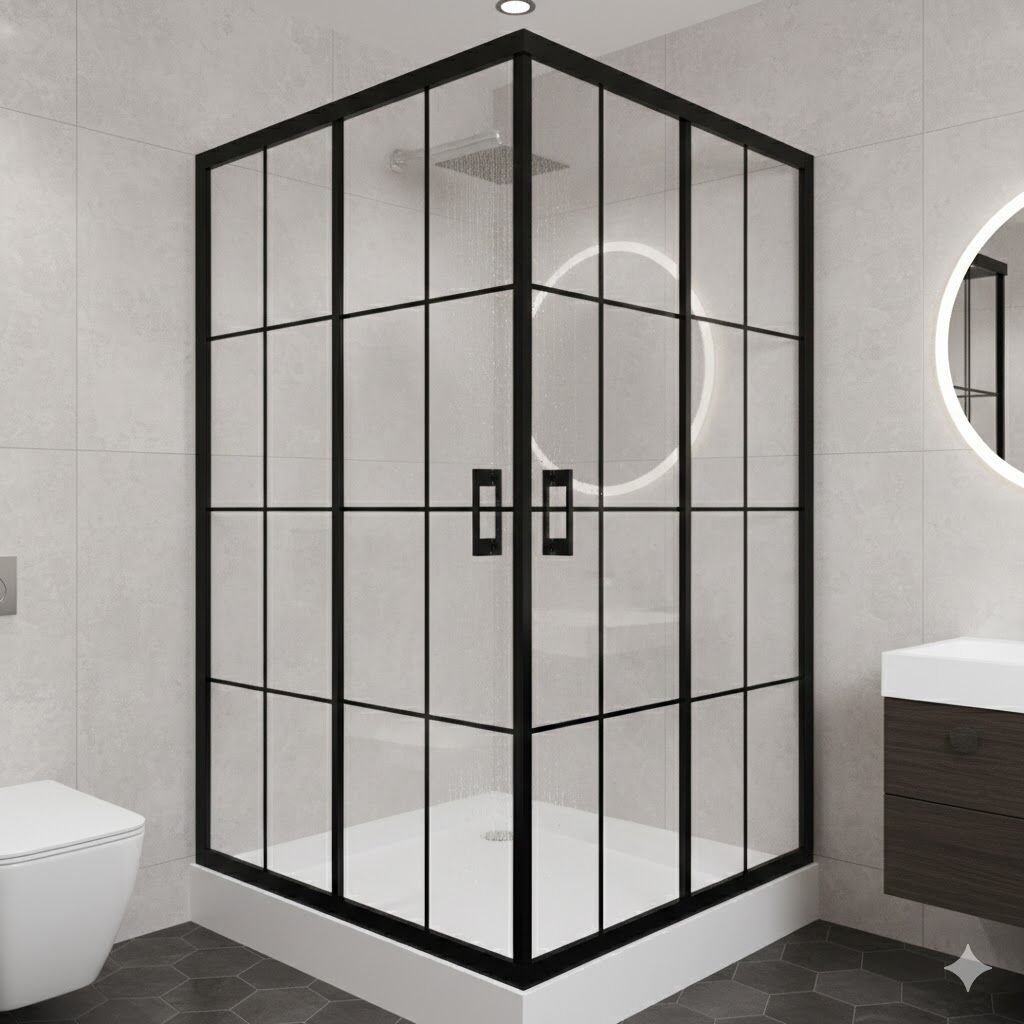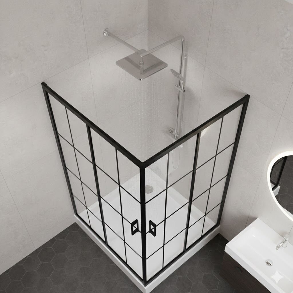 Kare formda tasarlanan yapısı, siyah profil detayları ile güçlü ve minimal bir duruş sunar. Çizgili kareloj desenli cam yüzeyi banyonuza özgün bir stil kazandırırken, aynı zamanda mahremiyet sağlar.