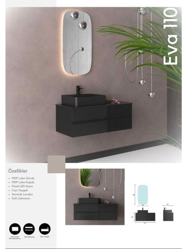 Dayanıklı MDF gövde yapısı suya ve buhara karşı dirençli olup uzun ömürlü kullanım sunar. Ergonomik tasarımı ve işlevsel çekmeceleri, banyo eşyalarınızı düzenli bir şekilde saklamanıza yardımcı olur.