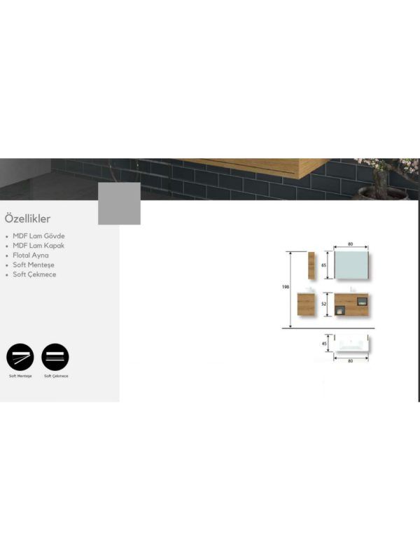 Dayanıklı MDF gövde yapısı suya ve buhara karşı dirençli olup uzun ömürlü kullanım sunar. Ergonomik tasarımı ve işlevsel çekmeceleri sayesinde banyo eşyalarınızı düzenli bir şekilde saklamanıza yardımcı olur.
