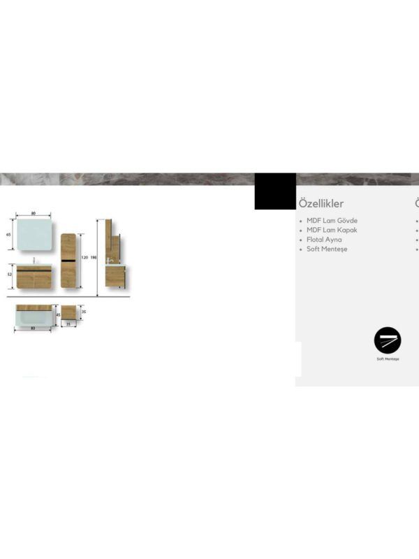 Üründe kullanılan flotal ayna, net ve uzun süreli yansıtma özelliği ile konforlu bir kullanım sağlarken, soft menteşe sistemi kapakların sessiz ve yavaş kapanmasına yardımcı olur. Şık ve hijyenik seramik lavabo, banyo dolabını estetik açıdan tamamlar.