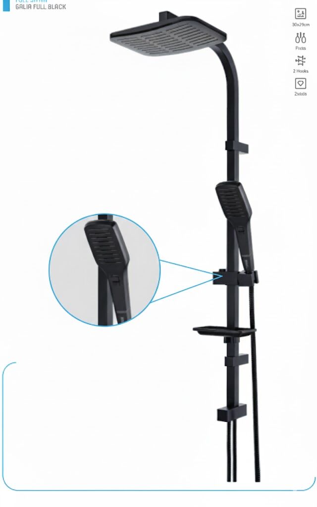 Galia Full Siyah Duş Sistemi, modern ve minimalist banyo tasarımları için özel olarak tasarlanmıştır.