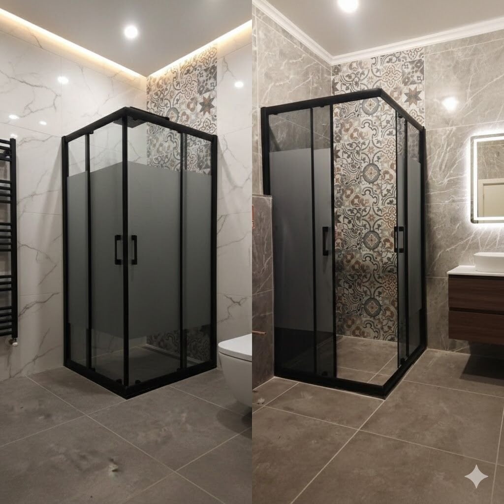 Siyah Profilli Ortası Kumlu Füme Cam Duşakabin, banyolarda hem şık bir görünüm hem de mahremiyet sağlayan fonksiyonel bir modeldir. İki duvar arası montaj yapısı alan kullanımını optimize eder ve banyo dekorasyonuna modern bir dokunuş kazandırır.