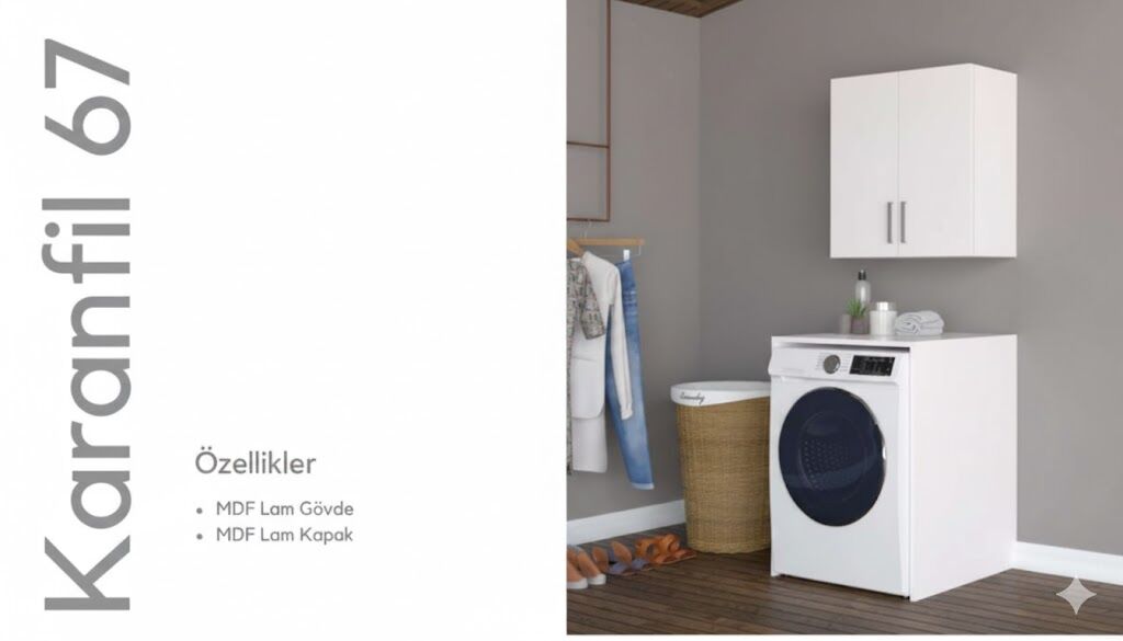 Karanfil 67 cm Çamaşır Makinesi Dolabı ve Üst Kapaklı Depo Dolabı, çamaşır alanlarında düzeni ve estetiği bir arada sunmak için tasarlanmıştır.