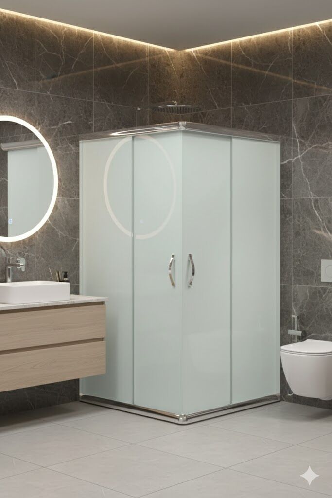 Tamamı buzlu cam yapısı sayesinde yüksek düzeyde mahremiyet sağlarken, krom kaplamalı profilleri banyoya ferah ve şık bir görünüm kazandırır.
