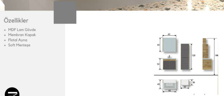 65 cm genişliği sayesinde alanı verimli kullanırken, lavabolu set yapısı ile pratik, düzenli ve konforlu bir banyo deneyimi sunar.