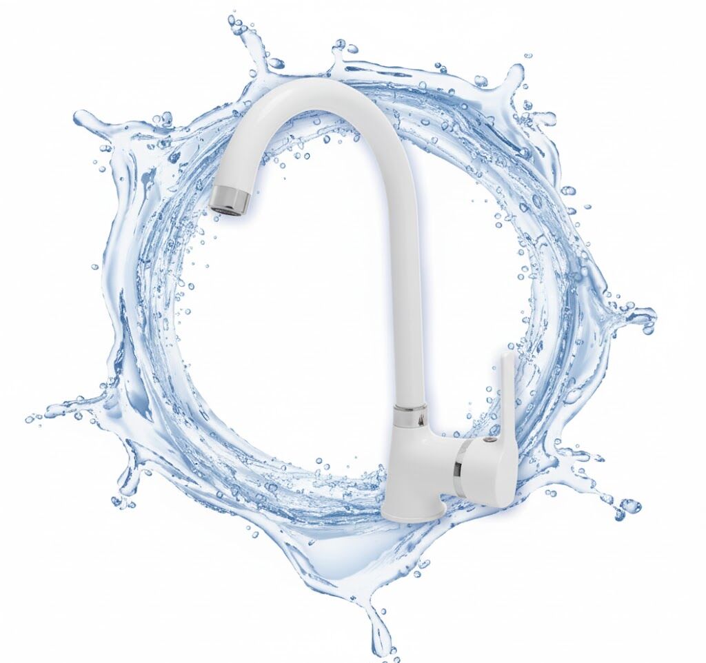 Okyanus Beyaz Kuğu Eviye Bataryası, yüksek ve kıvrımlı kuğu formu sayesinde mutfakta geniş hareket alanı ve rahat kullanım sunar.