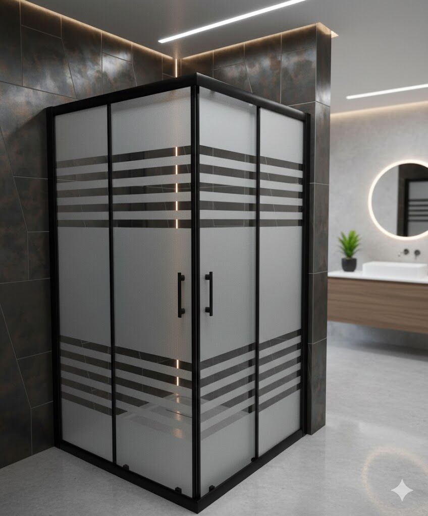 Ortası tam kumlu çizgi desenli duşakabin, mahremiyet ve modern tasarımı bir arada sunan şık bir banyo çözümüdür.