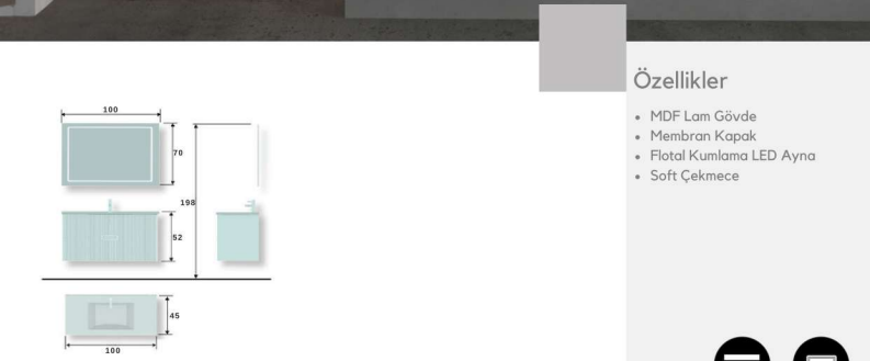 100 cm genişliği sayesinde ferah bir kullanım alanı sunarken, lavabolu set yapısı ile hem estetik hem de fonksiyonelliği bir araya getirir.