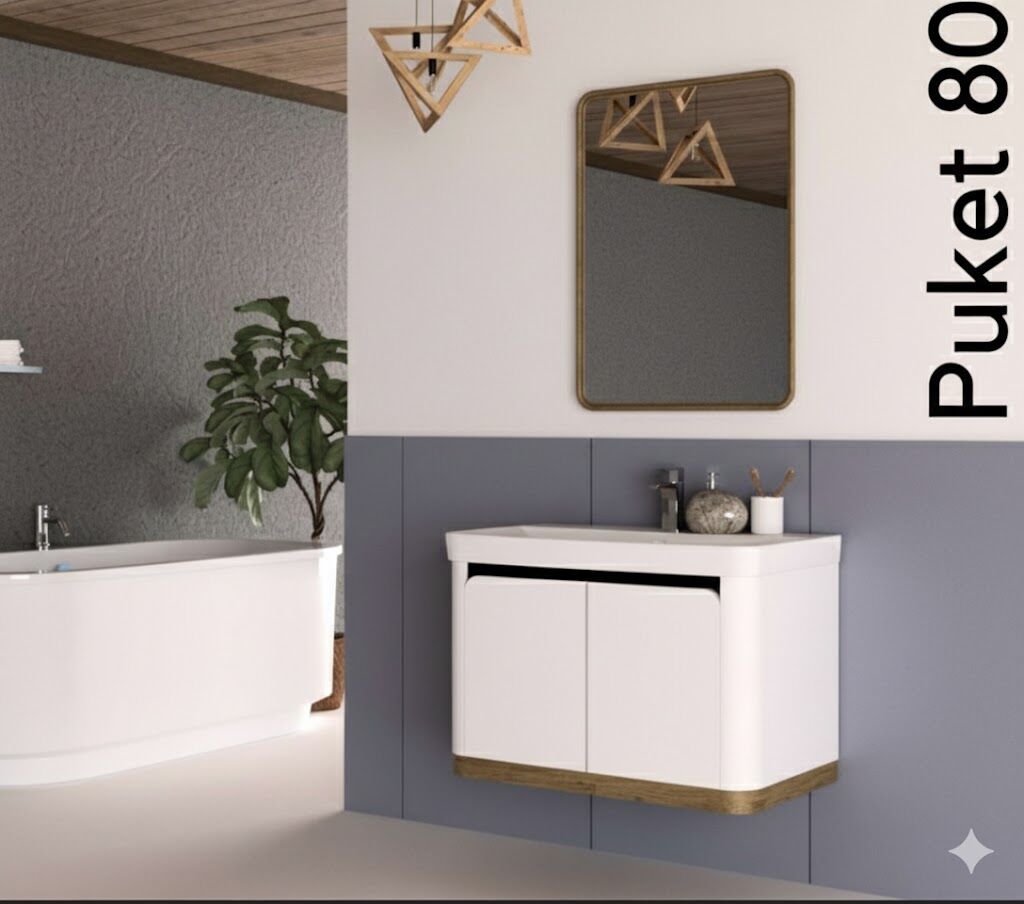 Puket 80 cm Lavabolu Banyo Dolabı, sade çizgileri ve kullanışlı ölçüsüyle orta ölçekli banyolar için ideal bir çözümdür.