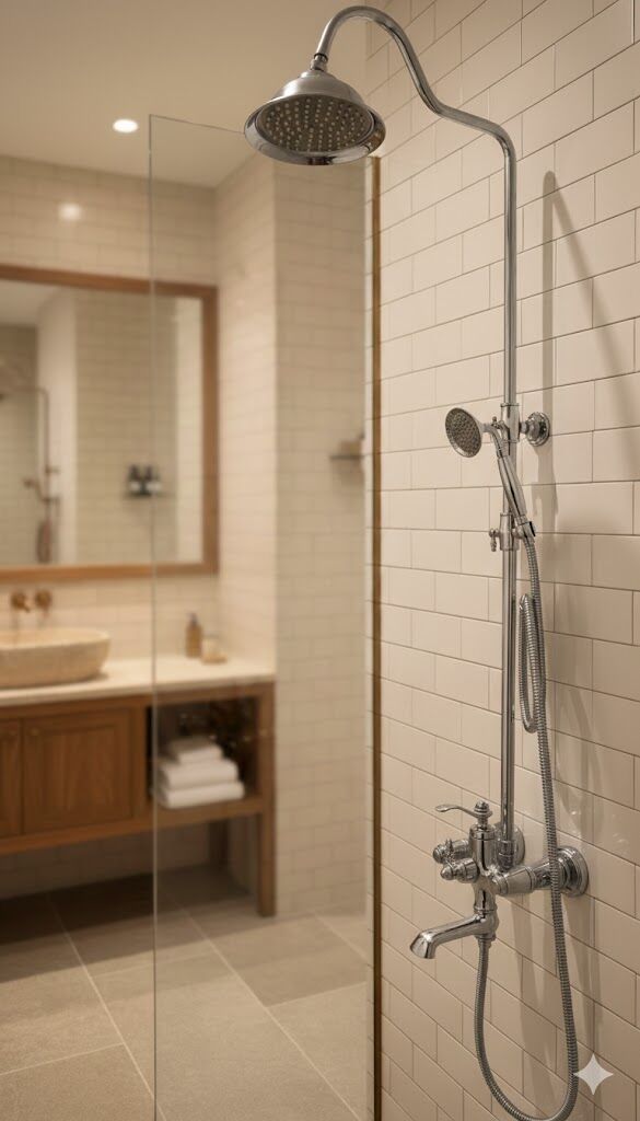 Geniş üst duş başlığı ve ergonomik el duşu, dengeli su akışı ile konforlu bir duş deneyimi sunar. Rustik detayları sayesinde vintage, klasik ve country tarzı banyo dekorasyonlarıyla uyum içindedir.
