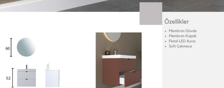 60 cm genişliği sayesinde alanı verimli kullanırken, lavabolu set yapısı ile pratik ve düzenli bir banyo deneyimi sunar.