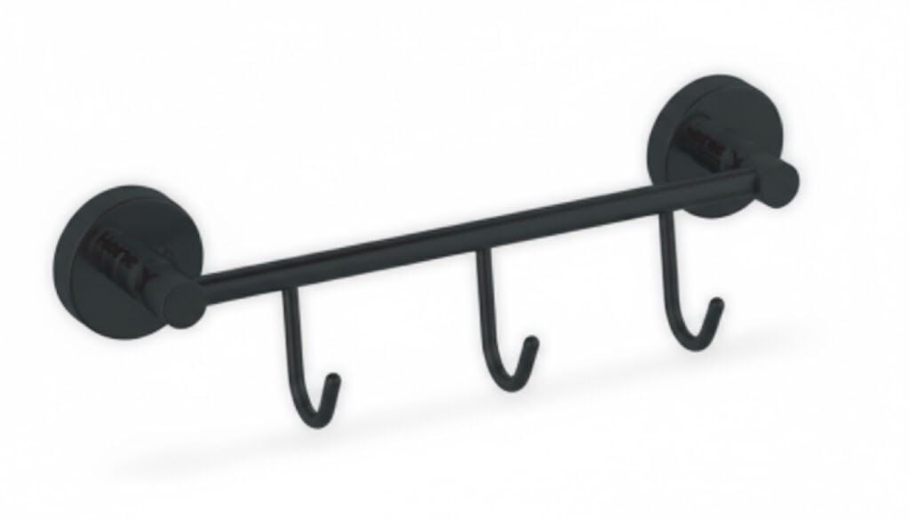 Siyah Üçlü Askılık, banyo ve mutfak alanlarında düzen ve şıklığı bir arada sunan modern tasarımlı bir duvar aksesuarıdır. Duvara monte edilen sağlam yapısı sayesinde güvenli kullanım sağlarken, üçlü askı tasarımı ile havlu, bornoz, lif veya mutfak bezlerini düzenli şekilde asmanıza olanak tanır.