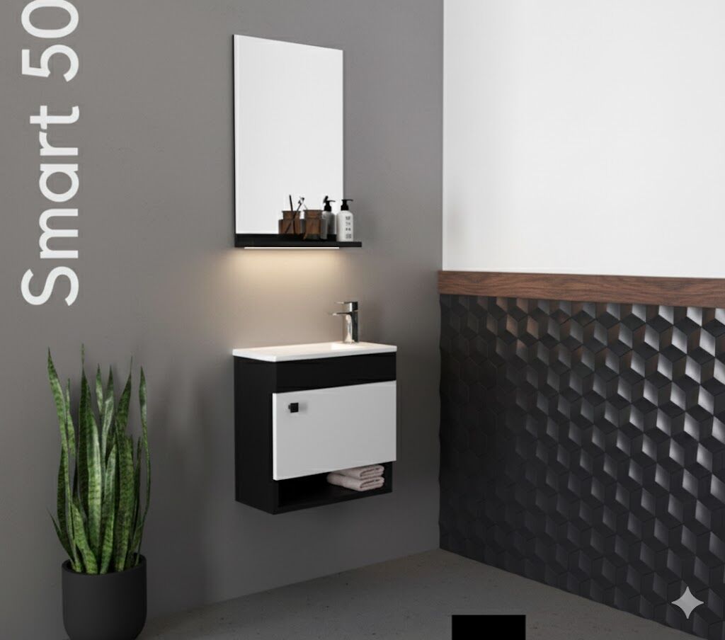 Smart 50 cm Lavabolu Banyo Dolabı, dar alanlar için özel olarak tasarlanmış kompakt yapısıyla fonksiyonellik ve modern görünümü bir arada sunar.