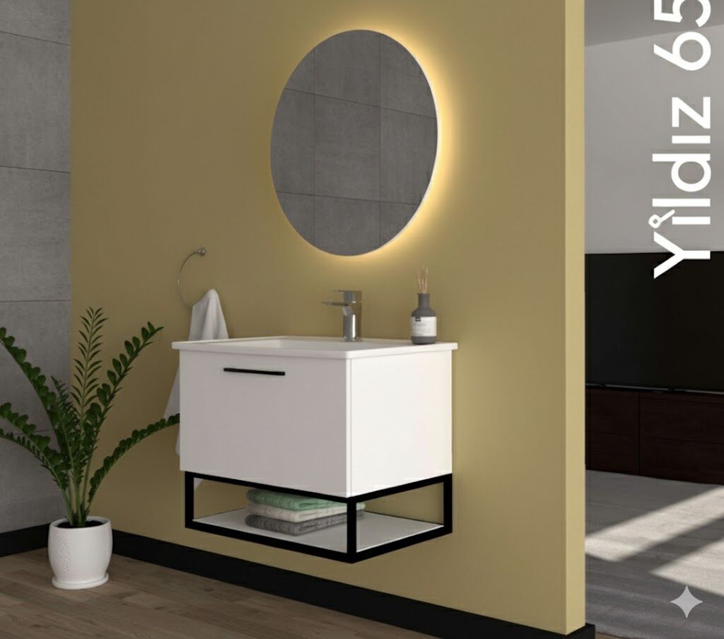 Yıldız 65 cm Lavabolu Banyo Dolabı, kompakt ölçüsü ve modern tasarımıyla küçük ve orta ölçekli banyolar için ideal bir çözümdür.
