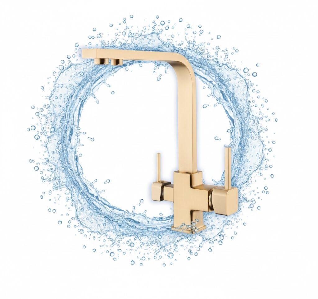 Gold arıtmalı eviye bataryası, lüks mutfak bataryası ve çift çıkışlı eviye musluğu arayan kullanıcılar için fonksiyonel ve şık bir tercihtir.